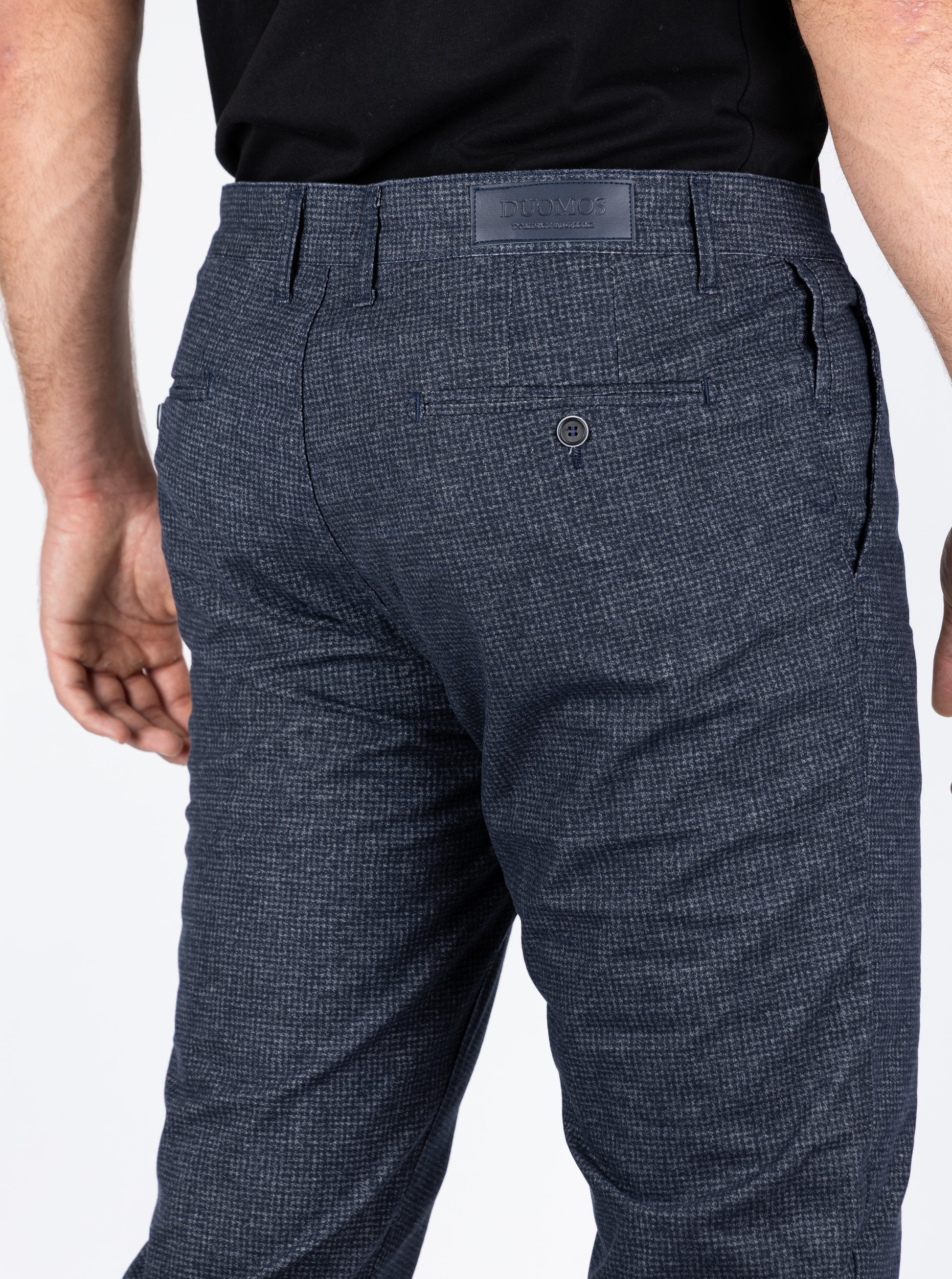 Ove teget chino pantalone sa finim karo dezenom i manžetnom dizajnirane su za muškarce koji žele da izgledaju sofisticirano, ali i opušteno. Neutralna boja sa diskretnim šarama pruža bezvremenski izgled, dok moderni detalji čine da pantalone budu podjednako pogodne za posao, izlazak ili svakodnevne prilike.