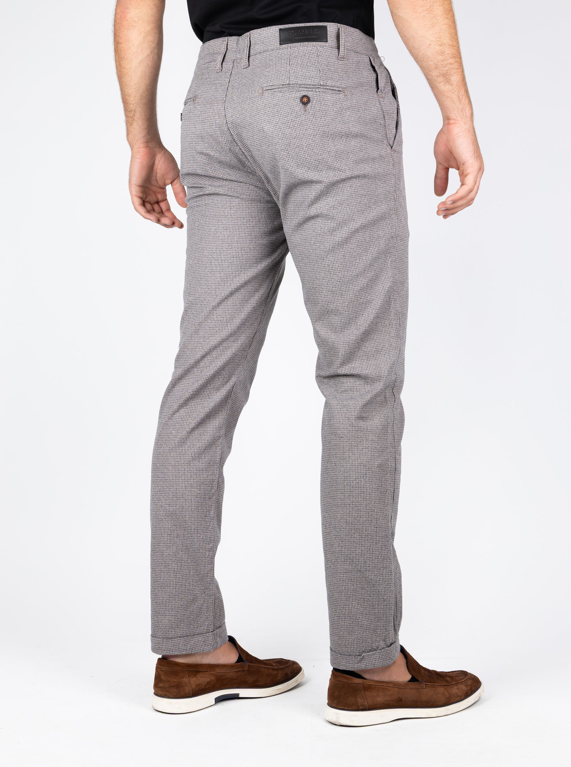 Ove sive chino pantalone sa finim karo dezenom i manžetnom dizajnirane su za muškarce koji žele da izgledaju sofisticirano, ali i opušteno. Neutralna boja sa diskretnim šarama pruža bezvremenski izgled, dok moderni detalji čine da pantalone budu podjednako pogodne za posao, izlazak ili svakodnevne prilike.