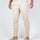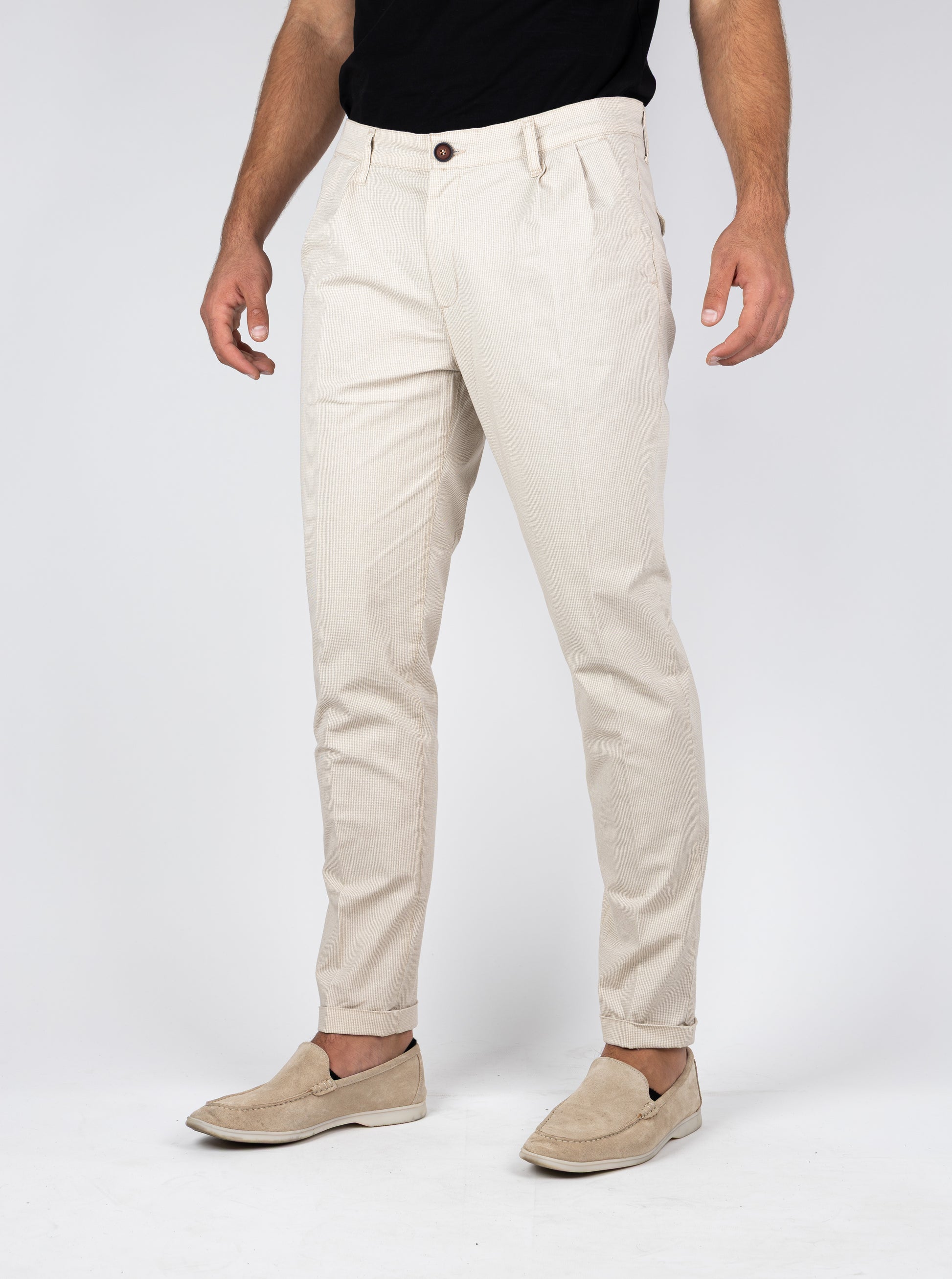 Ove muške pantalone izrađene su od laganog i udobnog materijala sa sitnim bež dezenom u prljavo beloj boji, što im daje elegantan, ali i svakodnevno nosiv izgled. Prednji deo krasi dve falte koje dodatno naglašavaju klasičnu formu, dok je linija duž nogavice izvedena na pegli, što im pruža uredan i sofisticiran izgled. Pozadi se nalaze patna džepovi, diskretno uklopljeni u dizajn. Nogavice se završavaju sa manžetnama, čime se postiže moderan i trendi kroj.