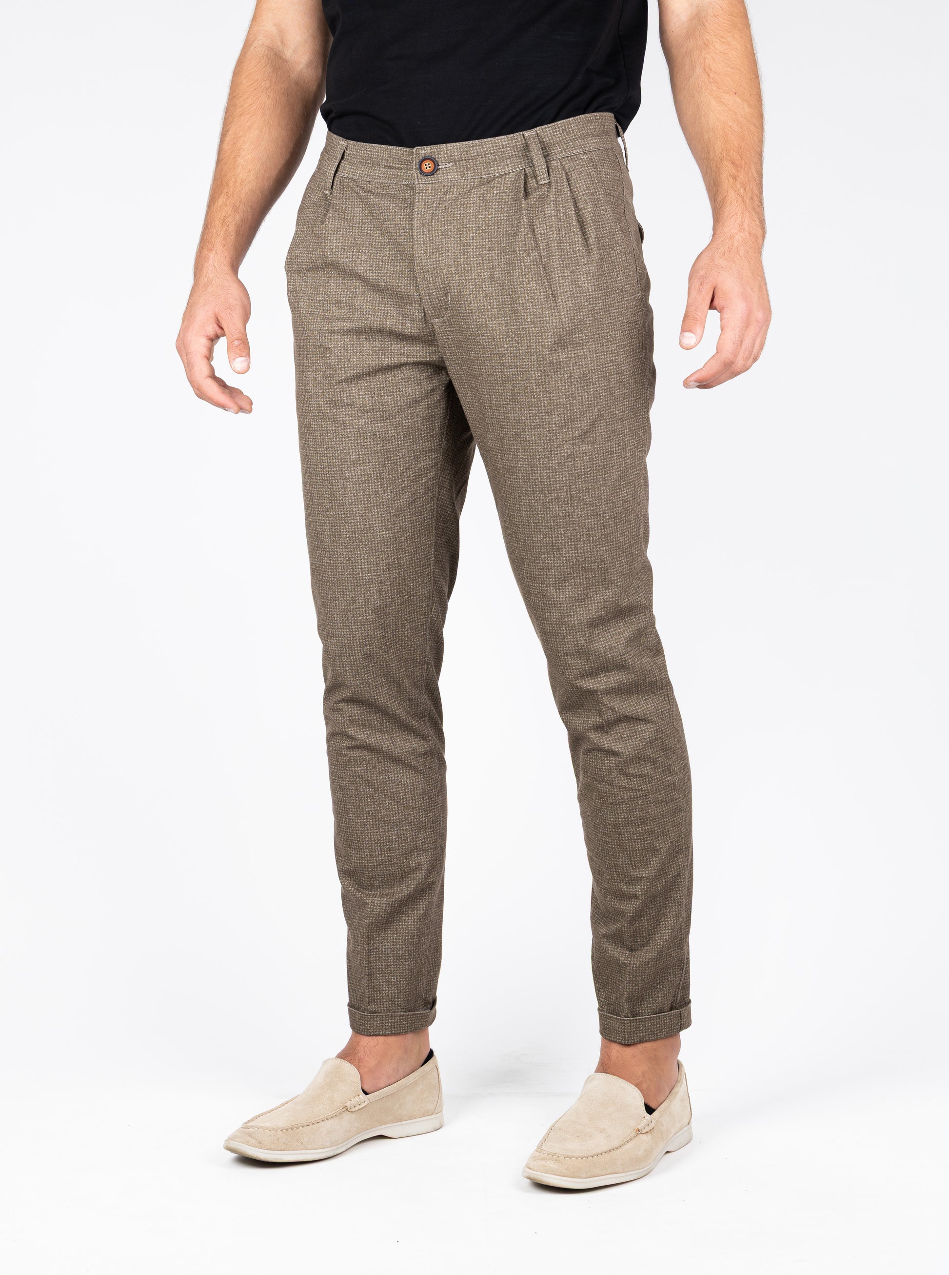 Ove muške pantalone izrađene su od laganog i udobnog materijala sa sitnim karom u braon boji, što im daje elegantan, ali i svakodnevno nosiv izgled. Prednji deo krasi dve falte koje dodatno naglašavaju klasičnu formu, dok je linija duž nogavice izvedena na pegli, što im pruža uredan i sofisticiran izgled. Pozadi se nalaze patna džepovi, diskretno uklopljeni u dizajn. Nogavice se završavaju sa manžetnama, čime se postiže moderan i trendi kroj.