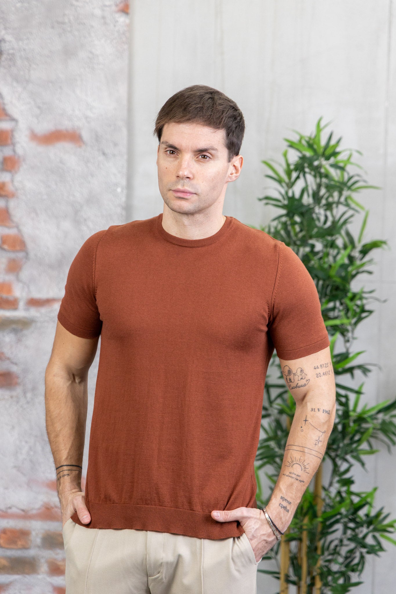 Fina tekstura daje majici luksuzan izgled i omogućava koži da diše. Klasičan okrugli izrez i rebraste ranfle na rukavima i struku osiguravaju da majica zadrži svoj oblik i savršeno pristaje. Cigla nijansa koja se lako kombinuje uz džins, bermude, pantalone ili čak lanena odela.