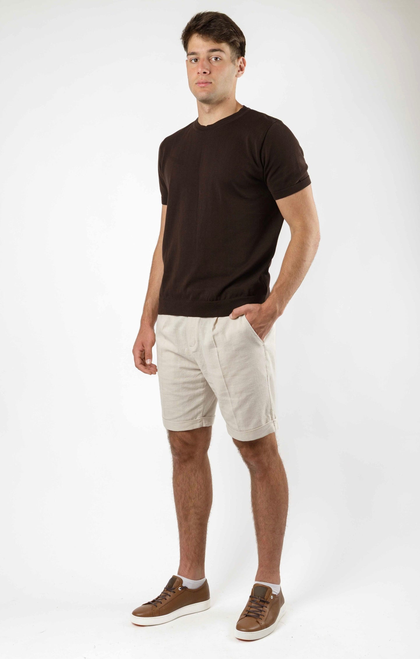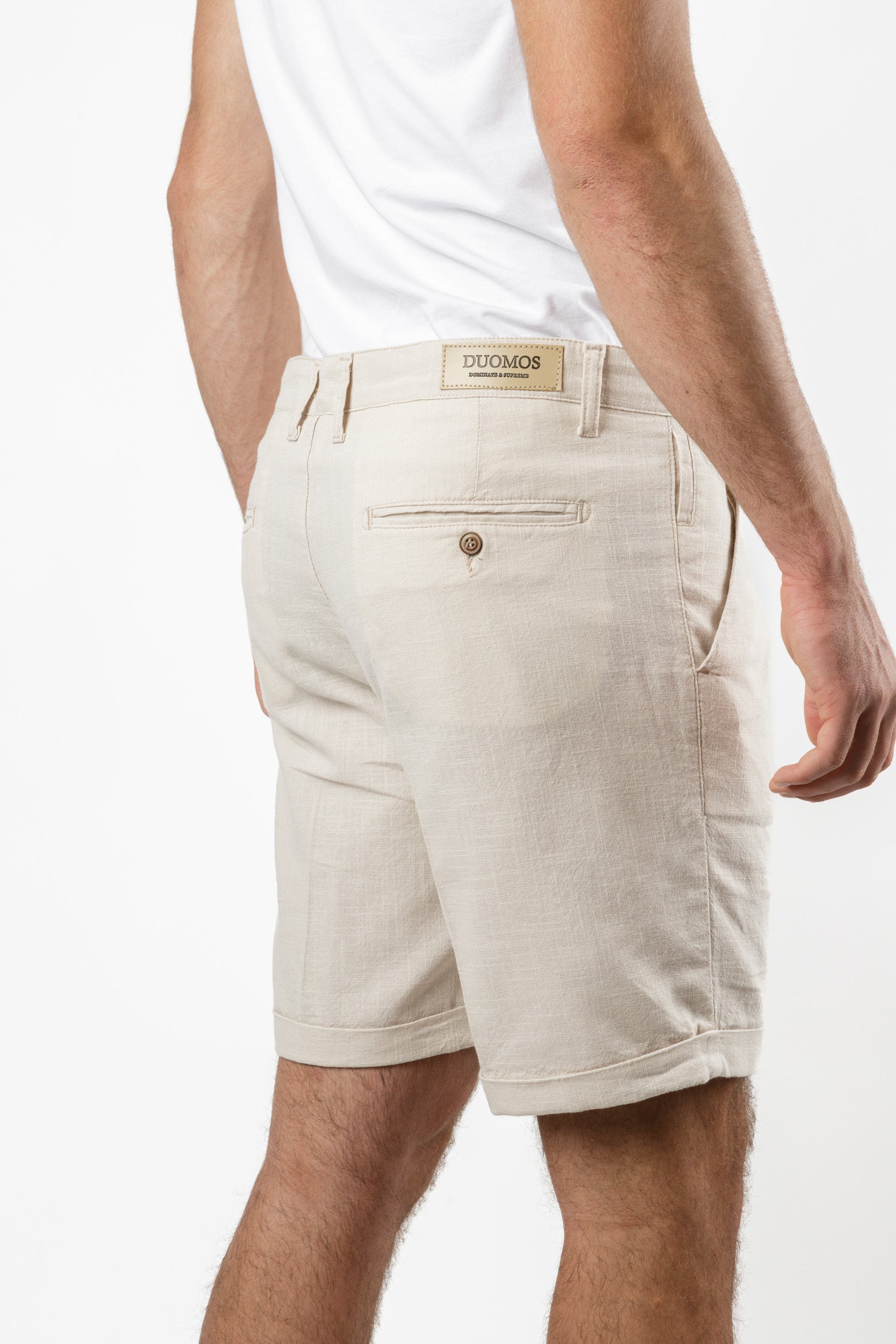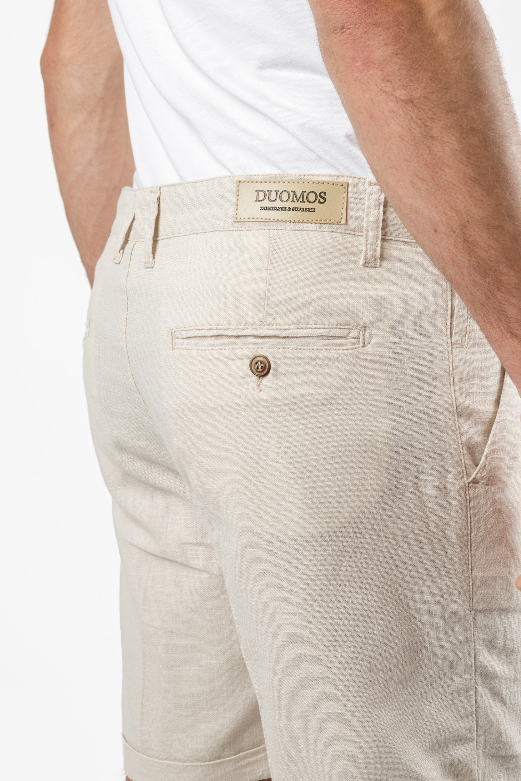 Lanene bermude u prirodnoj bež nijansi – oličenje letnje jednostavnosti i stila. Fino strukturirane, sa faltama, manžetnama i skrivenim dugmetom za čistiji vizuelni efekat. Lagan, prirodan materijal pruža prijatan osećaj tokom celog dana. Idealne su za kombinaciju sa tamnim tonovima, kao na slici – minimalistički, ali upečatljivo.