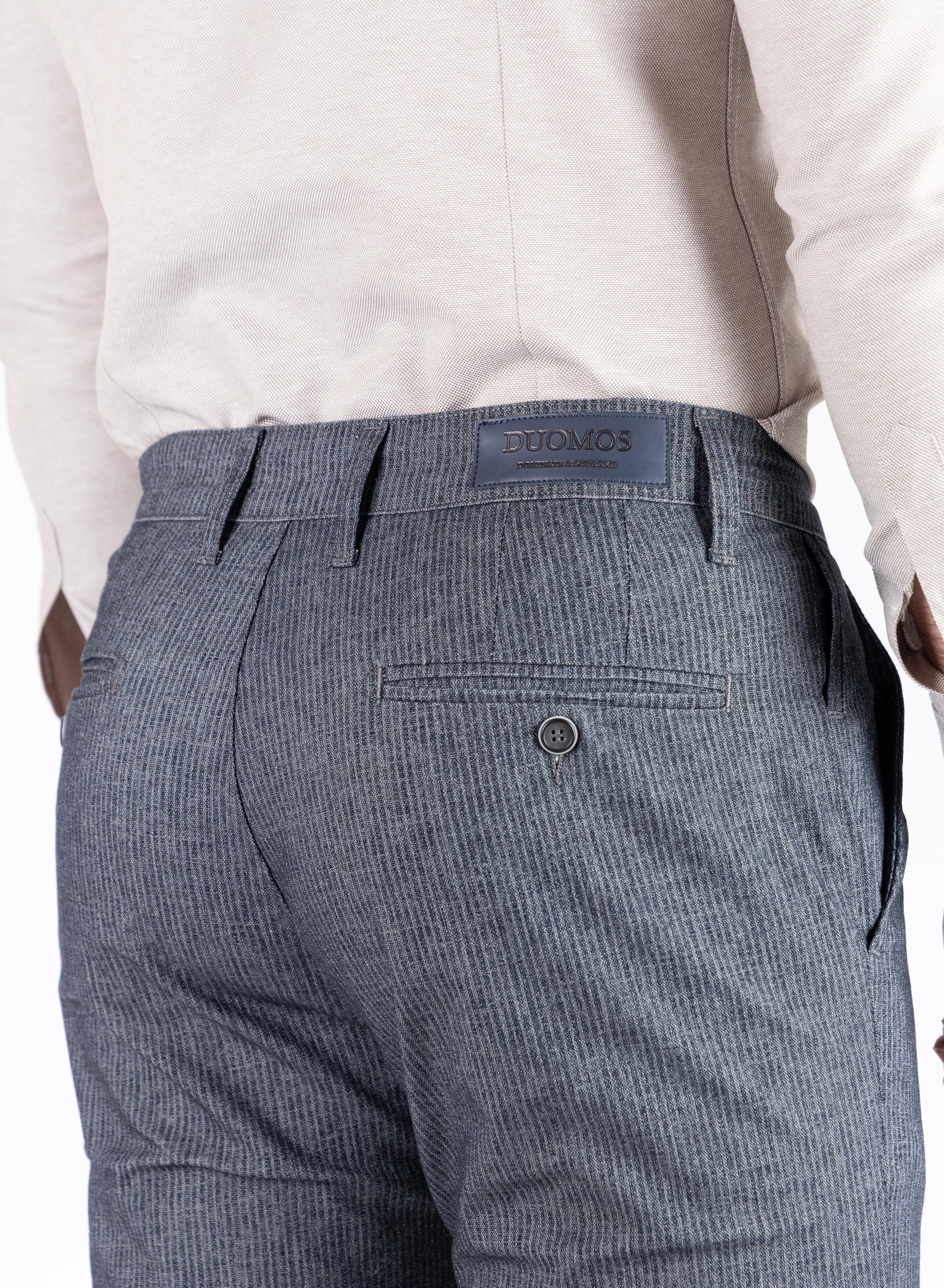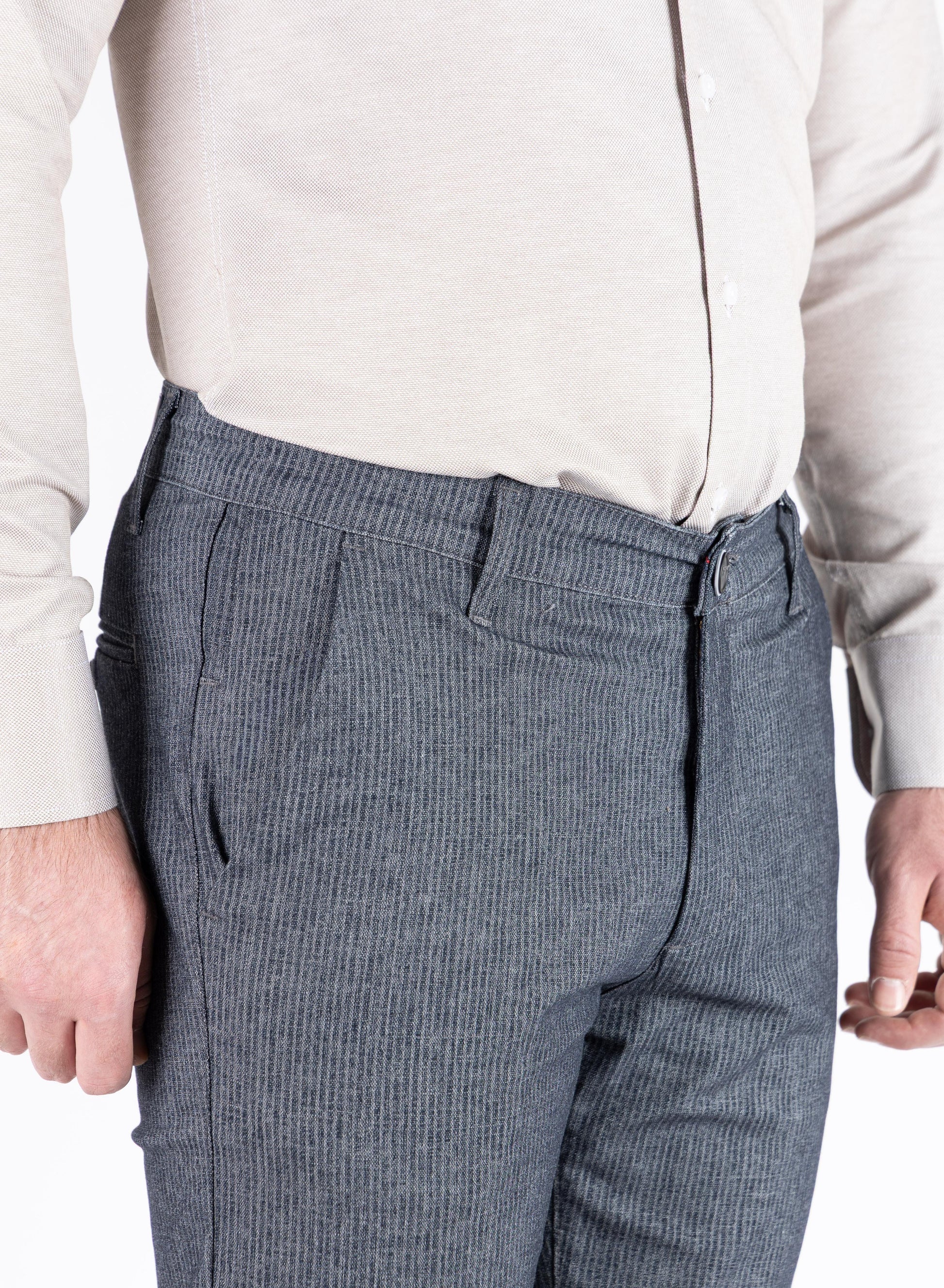 Muške chino pantalone u prljavo sivoj boji sa linijama po sebi. Klasičan i univerzalan komad garderobe koji se lako uklapa u svaku kombinaciju. Ove chino pantalone izrađene su od prijatnog i prozračnog materijala sa dodatkom elastina, što pruža udobnost i slobodu pokreta tokom celog dana.