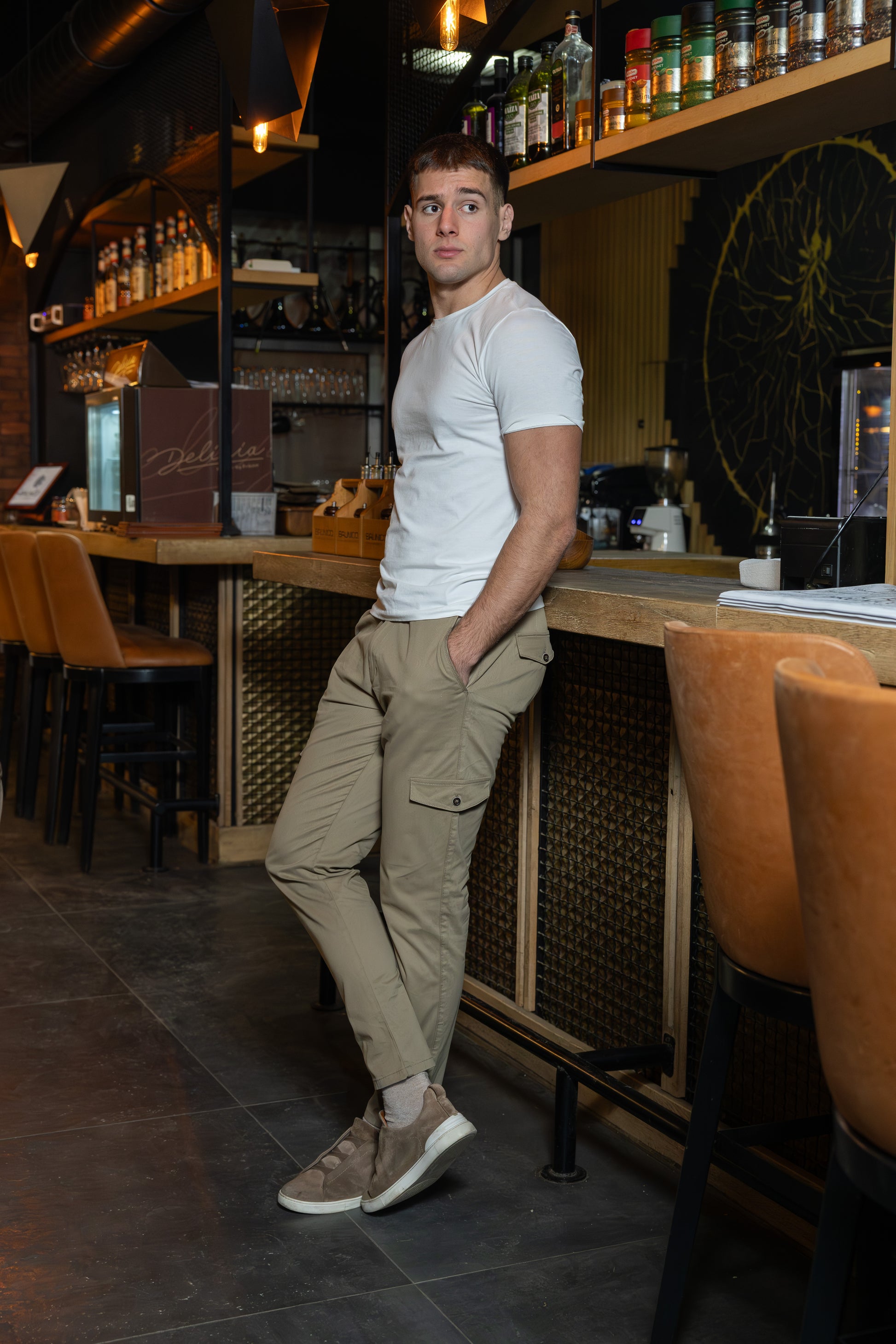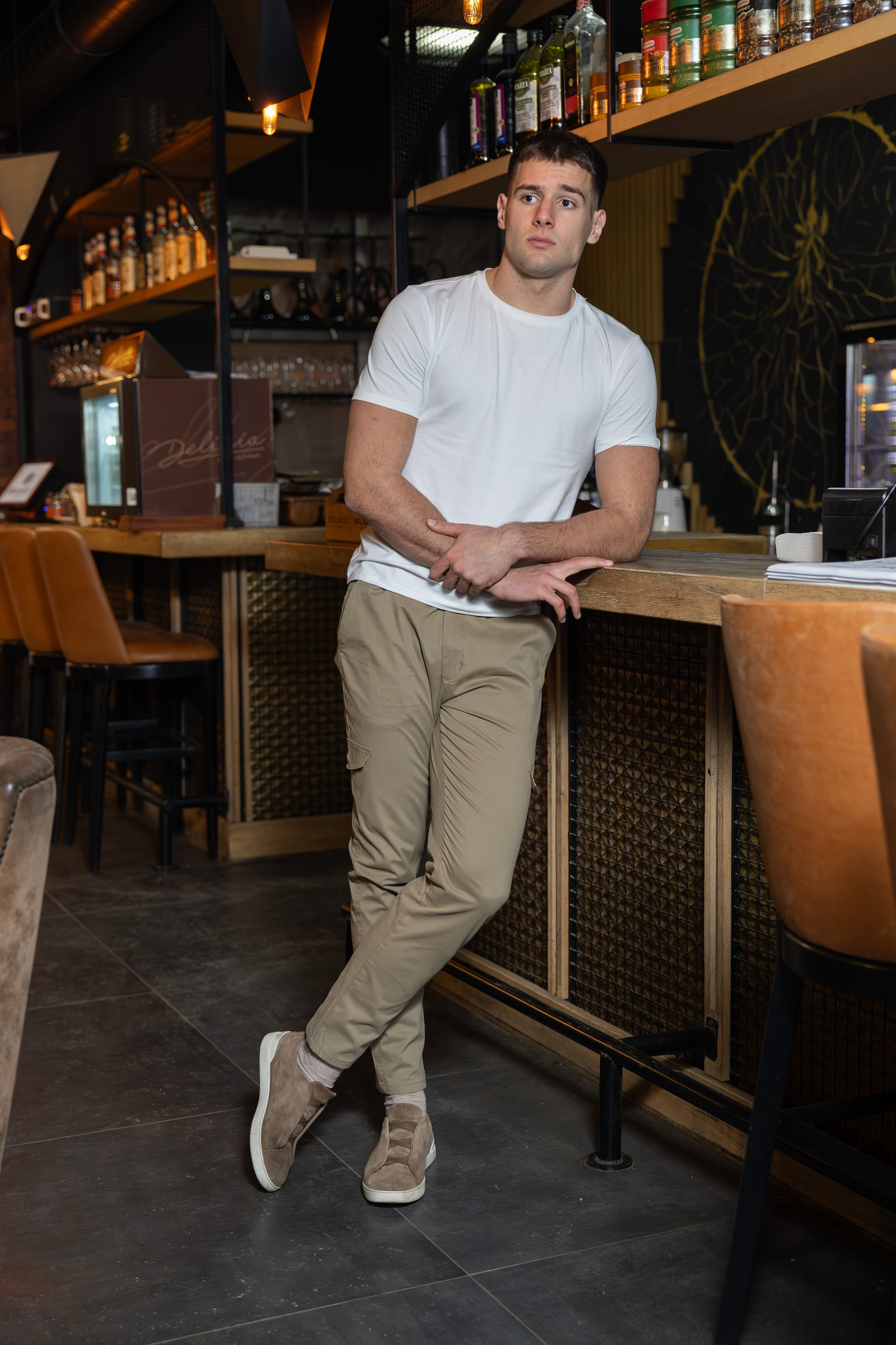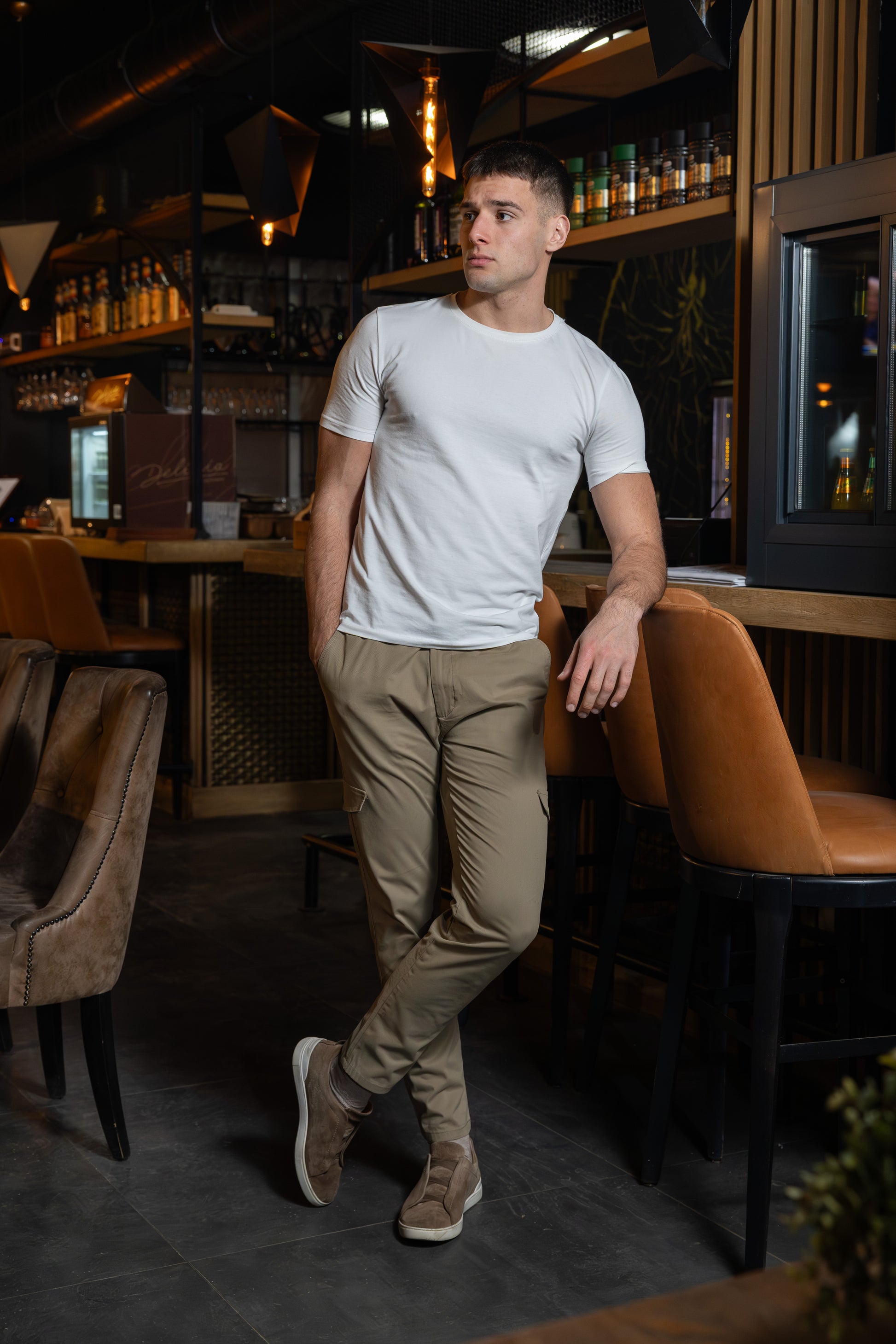 Muške kežual pantalone u bež boji sa imitacija bočnim džepovima. Klasičan i univerzalan komad garderobe daje sportsku eleganciju. Lako se uklapa uz džemper, majicu, košulju. Ove džeparice izrađene su od prijatnog i prozračnog materijala koji sa dodatkom elastina, što pruža udobnost i slobodu pokreta tokom celog dana.