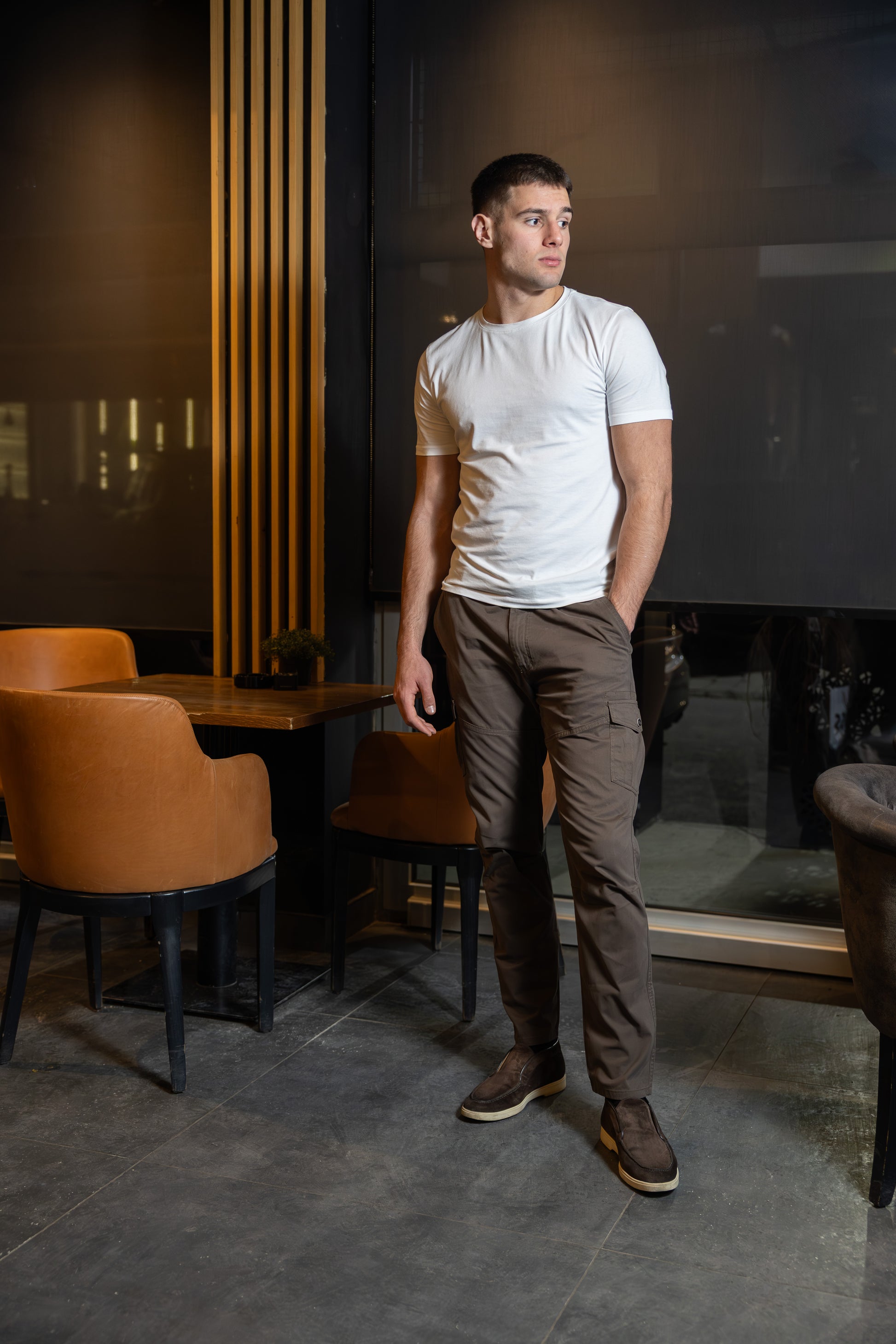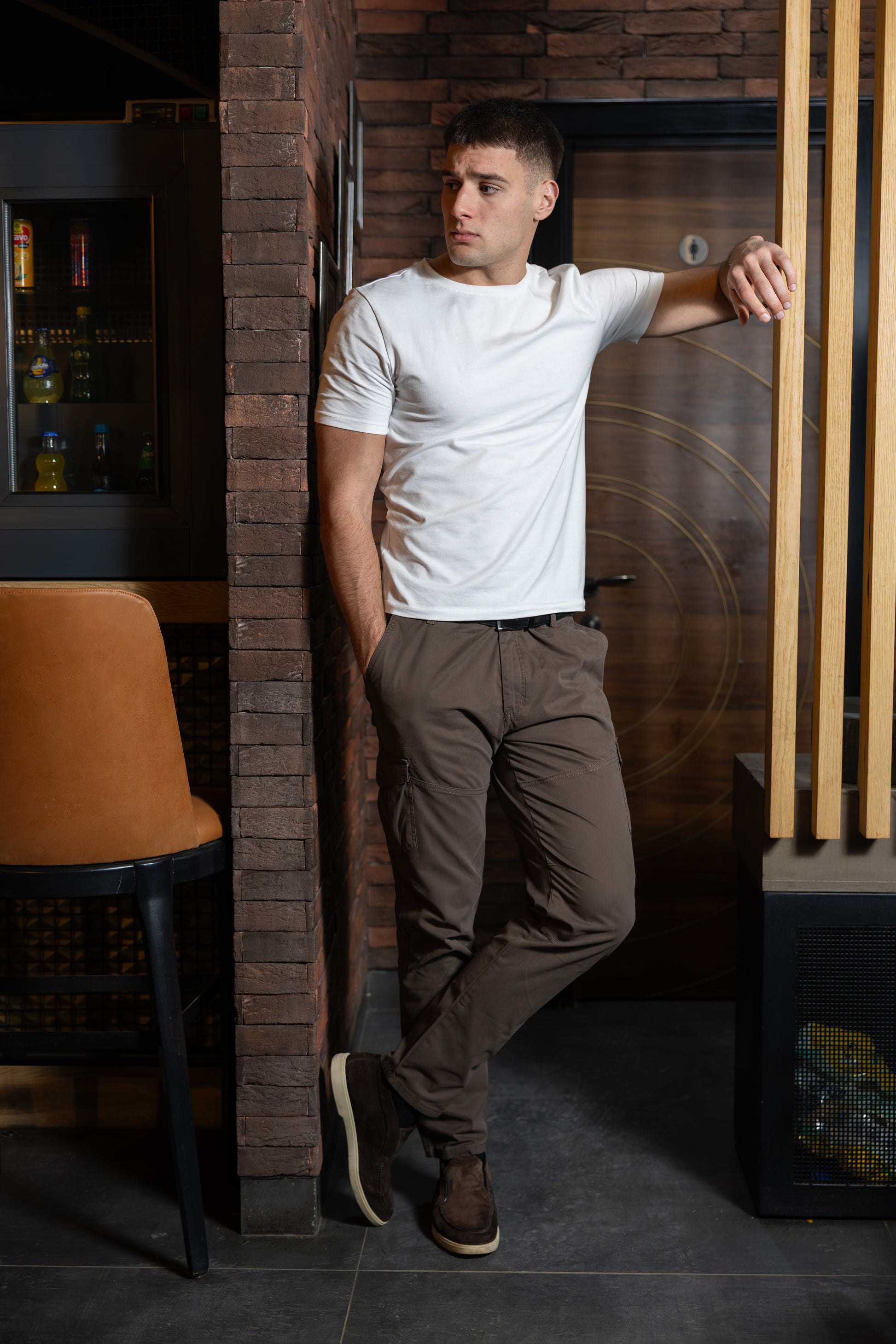 Muške džeparice u braon boji sa sa bočnim džepovima. Klasičan i univerzalan komad garderobe daje sportsku eleganciju. Lako se uklapa uz džemper, majicu, košulju. Ove džeparice izrađene su od prijatnog i prozračnog materijala koji sa dodatkom elastina, što pruža udobnost i slobodu pokreta tokom celog dana.