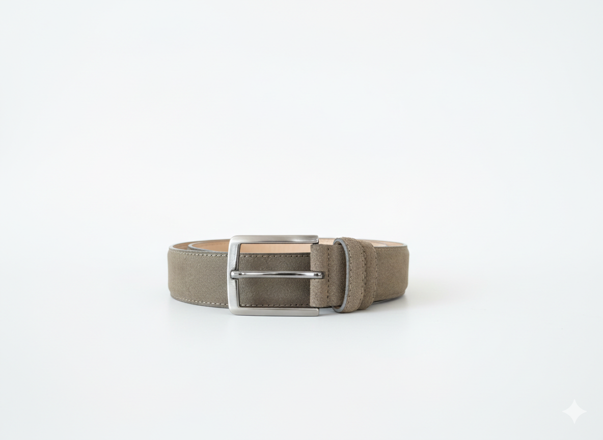 Upotpunite svoj stil ovim sofisticiranim kaišem izrađenim od visokokvalitetne prevrnute kože (velura). Specifična maslinasto-siva (taupe) nijansa i mat tekstura čine ga idealnim izborom za ljubitelje prefinjenog izgleda.