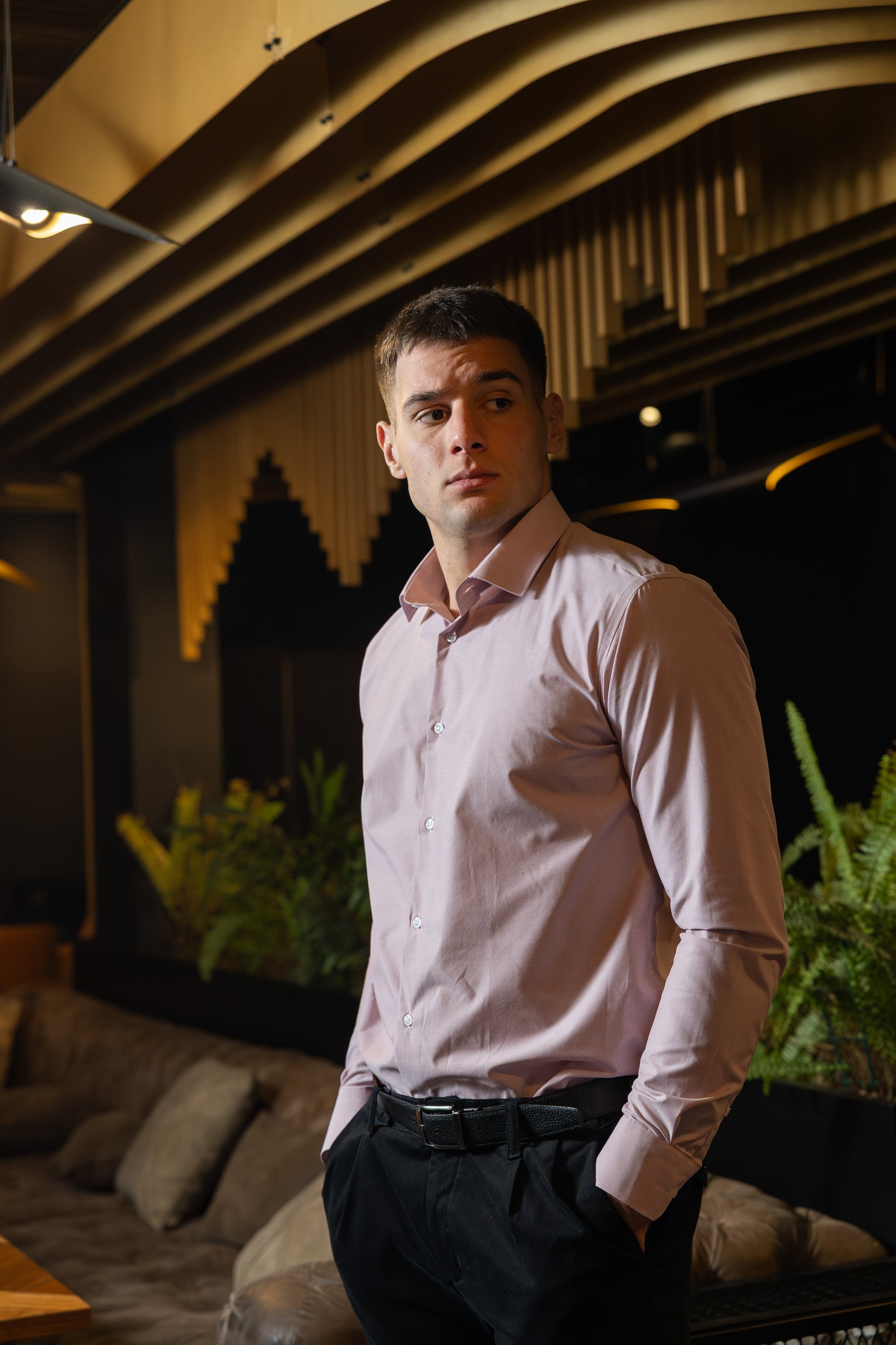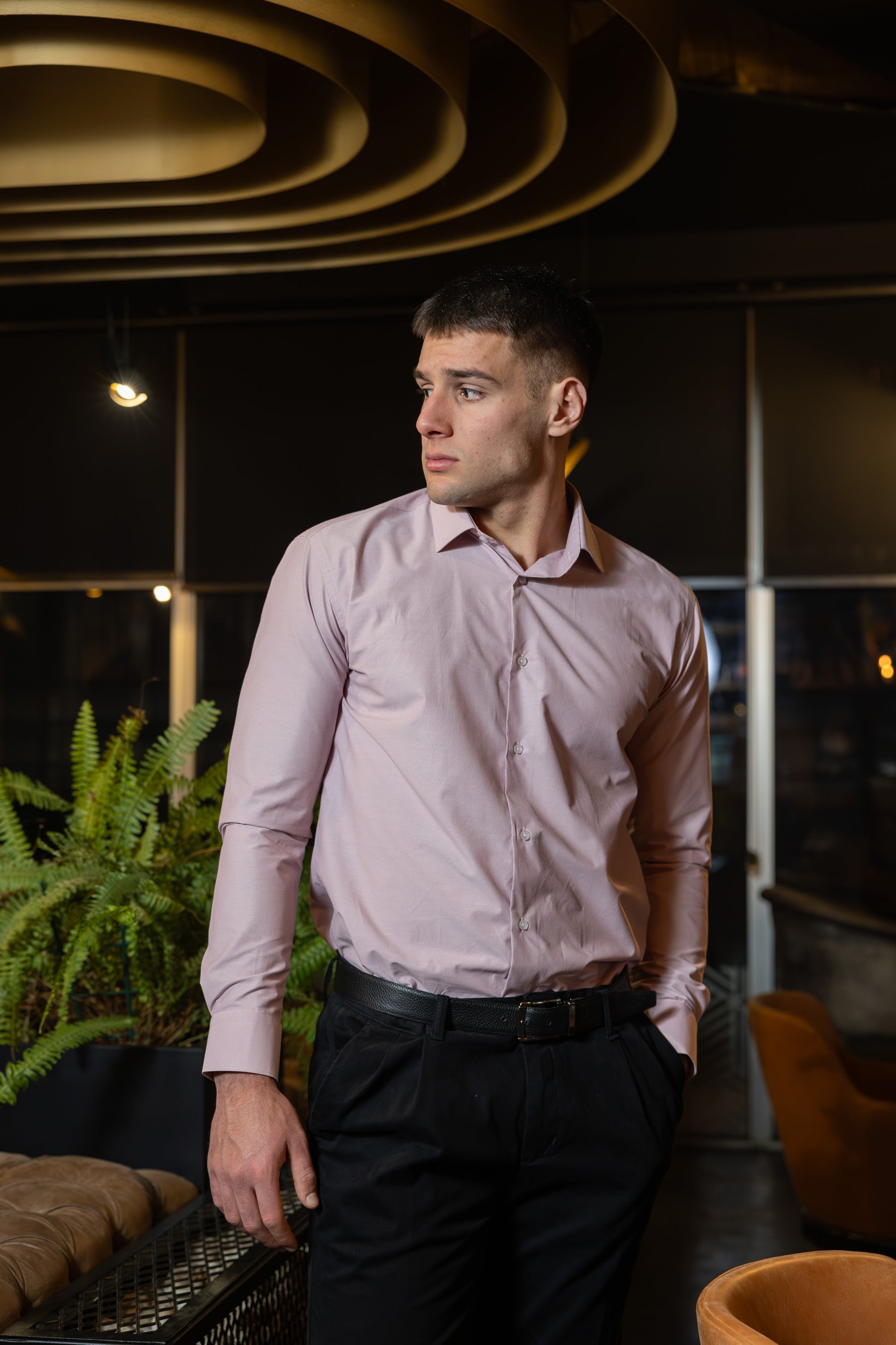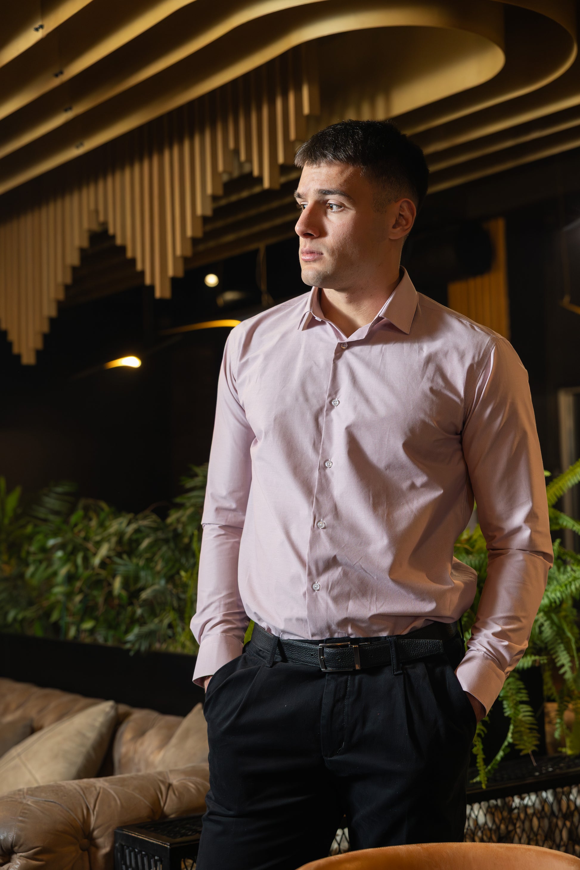Muška slim fit košulja sa diskretnim štrafta dezenom u crvenoj boji. Sitni, pravilni uzorak daje košulji sofisticiran i uredan izgled, idealan za poslovne i formalnije prilike.