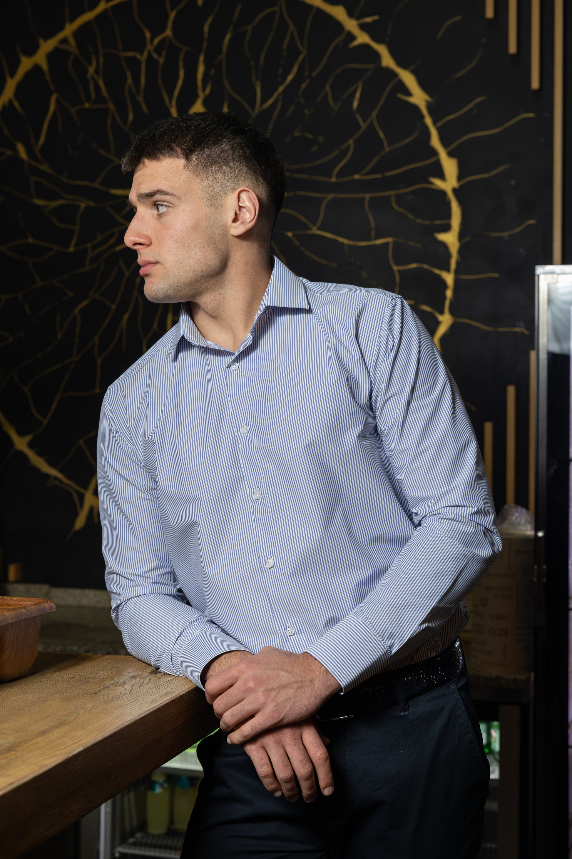Muška slim fit košulja sa štrafta dezenom dezenom u teget boji koji nikad ne izlazi iz mode. Sitni, pravilni uzorak daje košulji sofisticiran i uredan izgled, idealan za poslovne i formalnije prilike.