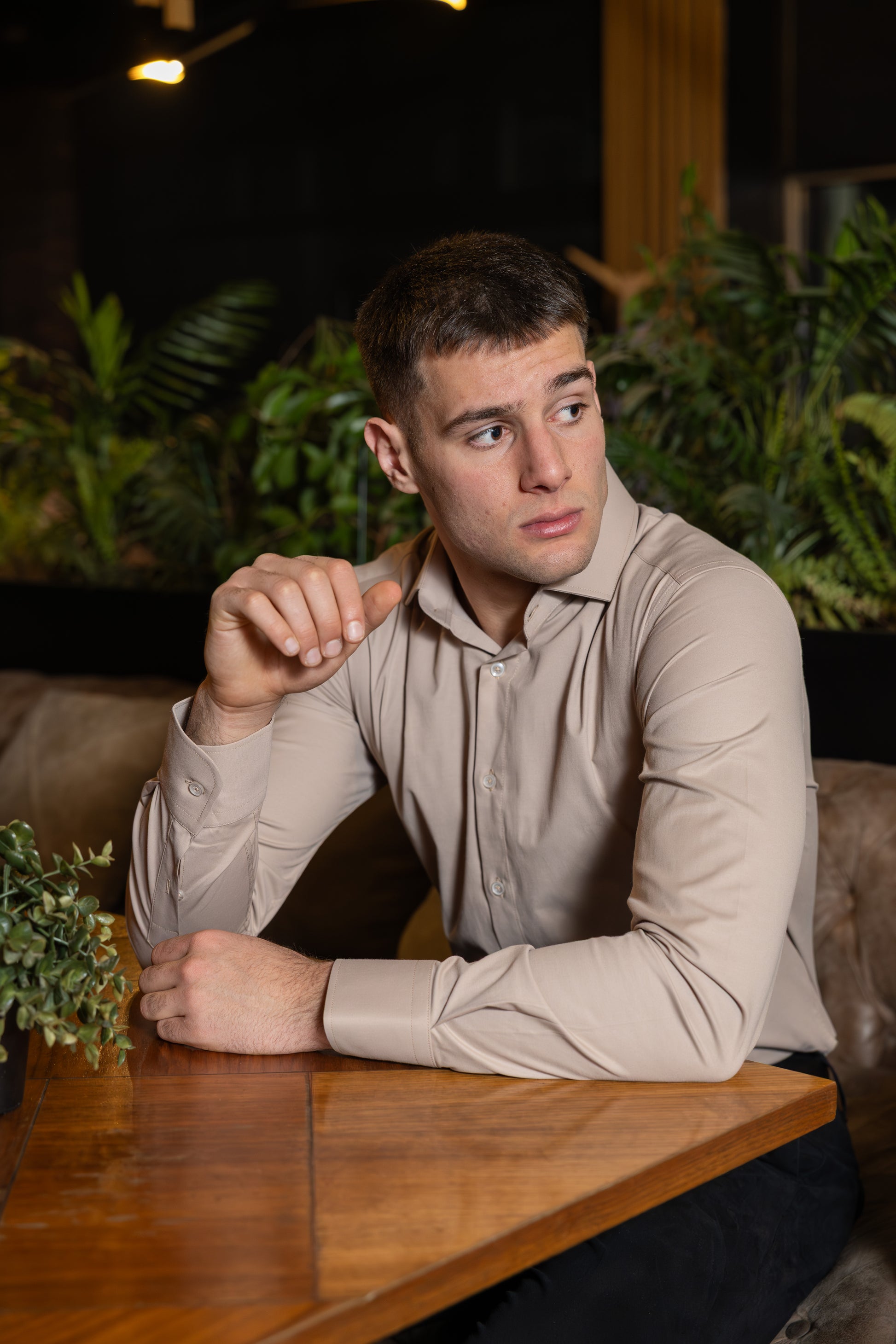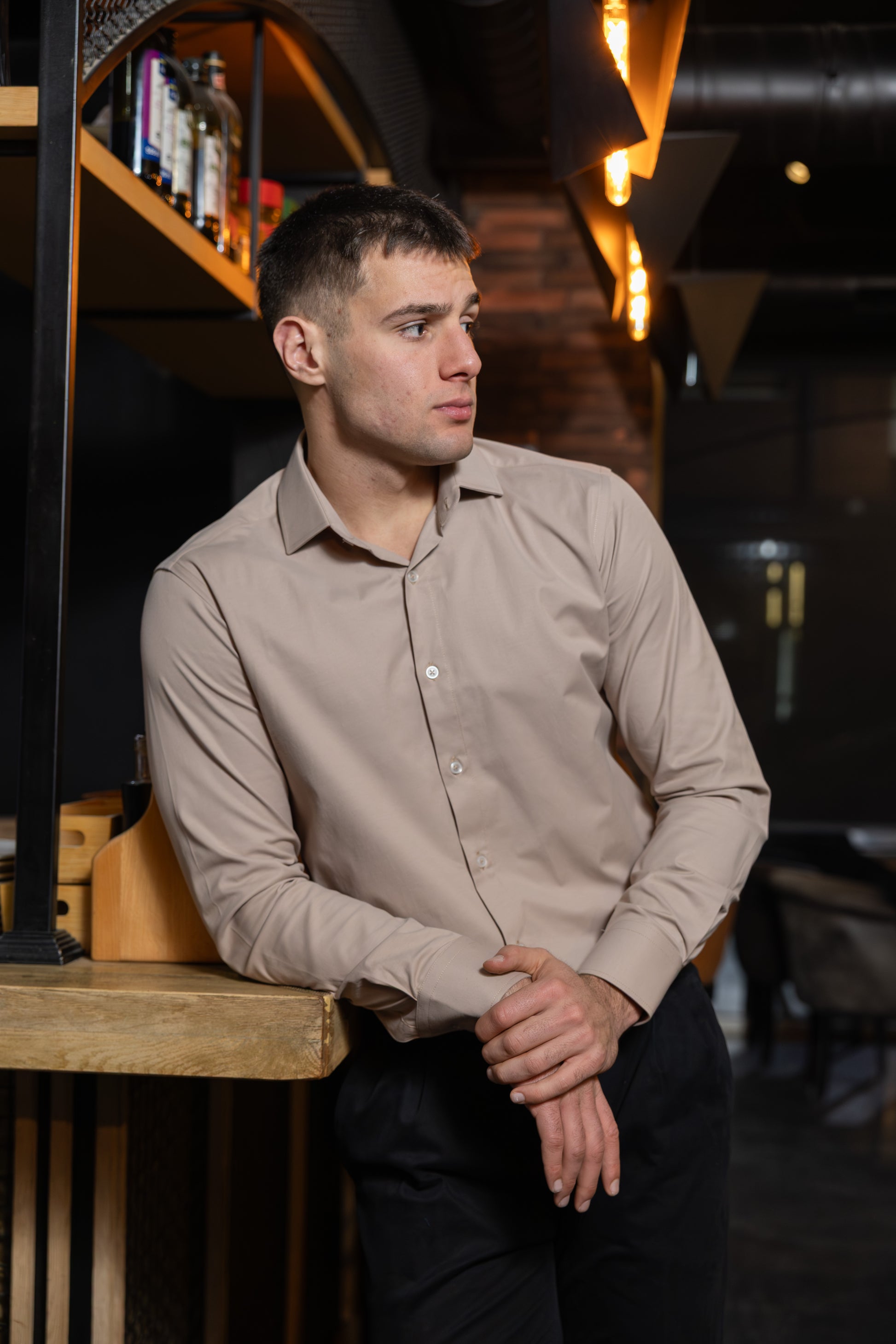 Minimalistička muška košulja u elegantnoj kapućino nijansi, idealna za sofisticiran i moderan izgled. Jednobojni dezen sa glatkom teksturom daje košulji sveden, luksuzan karakter i lako se uklapa u poslovne i smart-casual kombinacije.