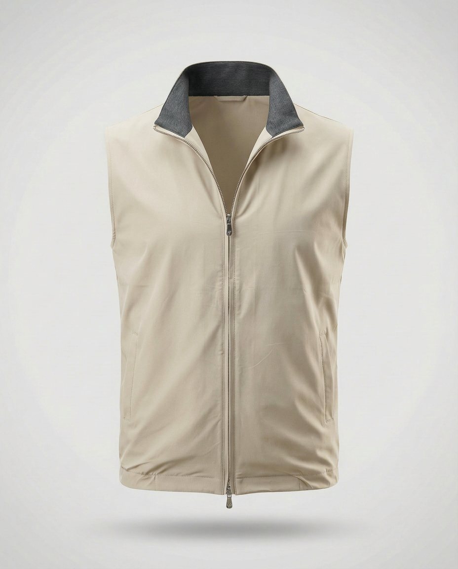 Ovaj muški prsluk u prefinjenoj bež nijansi predstavlja vrhunac funkcionalne elegancije. Dizajniran za muškarca koji ceni čiste linije i vrhunsku izradu, ovaj komad je nezaobilazan element garderobera za prelazne periode. Unutrašnjost stand-up kragne u antracit sivoj boji dodaje dubinu dizajnu i pruža prijatan osećaj mekoće pri kontaktu sa kožom.